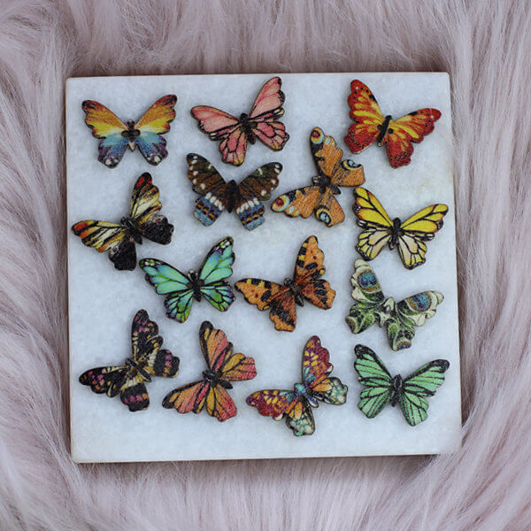 Träknappar med målad framsida och träfärgad baksida. Motiv fjäril. 2-hålsknapp. Storlek 25 mm. Blandade färger.